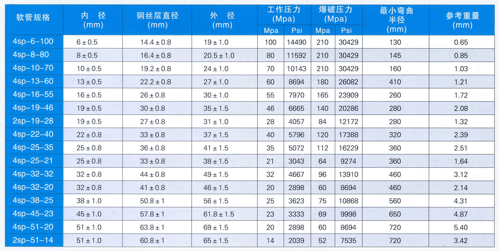 结 构:胶管由内胶层、四层钢丝缠绕层和外胶层组成。